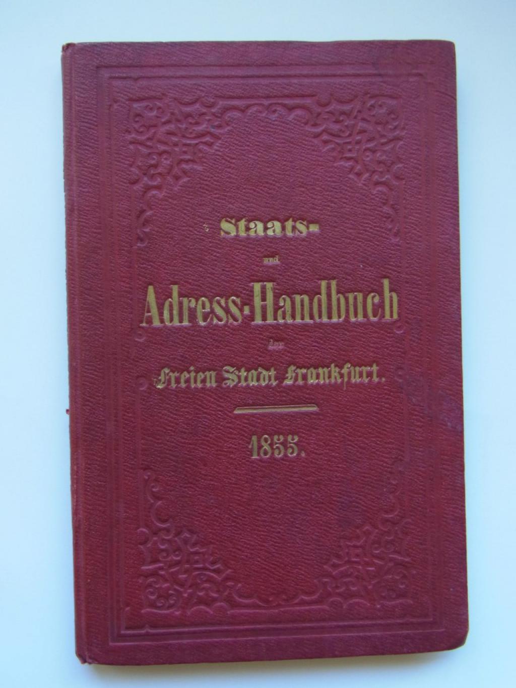 ![]() | Staats- und Adress-Handbuch der freien Stadt Frankfurt. 1855, 1855 Herausgeber nicht genannt. Frankfurt a. M., Georg Friedrich Krug's Verlags-Buchhandlung 1855, roter Leinenband mit blindgepr. Titelschmuck u. goldgepr. Titel, sowie goldgepr. Rückentitel, Inhalts-Verzeichnis u. Erklärung der Ordenszeichen etc XII , 8° 180 S., Einband sauber u. ohne Berieb, Buchdeckelecken gering gestaucht, Bindung stabil, Buchblock u. Blattseiten... mehr Regionalia/Frankfurt |
